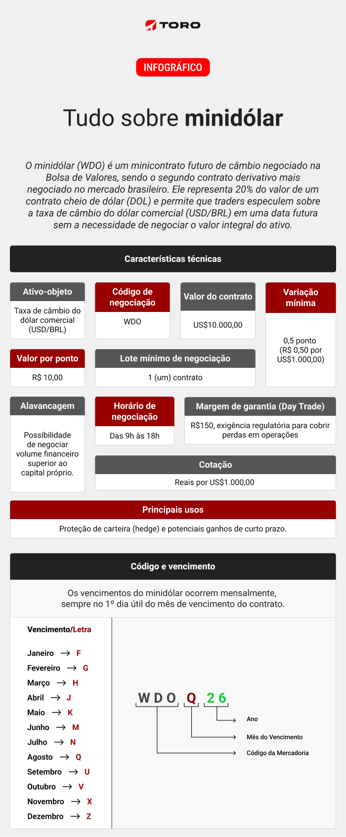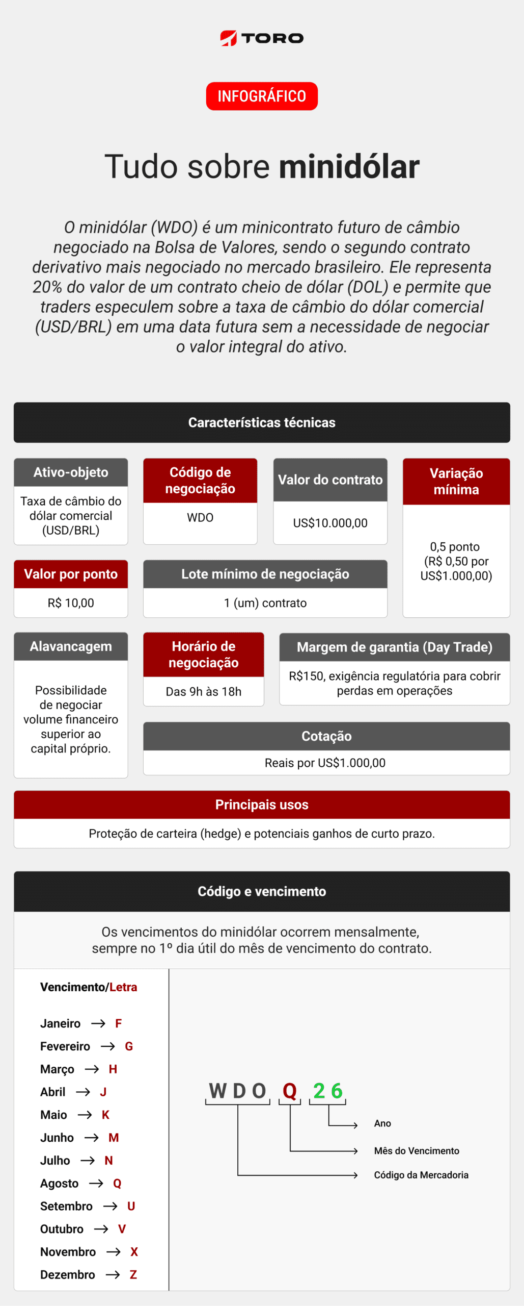 Vale ainda ressaltar que cada minicontrato da moeda é marcado pela sigla WDO, além de uma letra e de dois números. Eles significam, respectivamente, o mês e o ano de vencimento desse contrato.